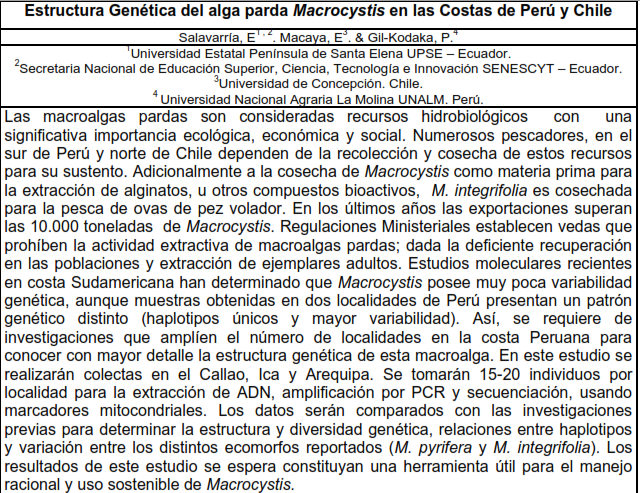 Las macroalgas pardas son consideradas recursos hidrobiológicos con una significativa importancia ecológica, económica y social. Numerosos pescadores, en el sur de Perú y norte de Chile dependen de la recolección y cosecha de estos recursos para su sustento. Adicionalmente a la cosecha de Macrocystis como materia prima para la extracción de alginatos, u otros compuestos bioactivos, M. integrifolia es cosechada para la pesca de ovas de pez volador. En los últimos años las exportaciones superan las 10.000 toneladas de macrocystis. Regulaciones Ministeriales establecen vedas que prohíben la actividad extractiva de macroalgas pardas; dada la deficiente recuperación en las poblaciones y extracción de ejemplares adultos. Estudios moleculares recientes en costa Sudamericana han determinado que Macrocystis posee muy poca variabilidad genética, aunque muestras obtenidas en dos localidades de Perú presentan un patrón genético distinto (haplotipos únicos y mayor variabilidad). Así, se requiere de investigaciones que amplíen el número de localidades en la costa Peruana para conocer con mayor detalle la estructura genética de esta macroalga. En este estudio se realizarán colectas en el Callao, Ica y Arequipa. Se tomarán 15-20 individuos por localidad para la extracción de ADN, amplificación por PCR y secuenciación, usando marcadores mitocondriales. Los datos serán comparados con las investigaciones previas para determinar la estructura y diversidad genética, relaciones entre haplotipos y variación entre los distintos ecomorfos reportados (M. pyrifera y M. integrifolia). Los resultados de este estudio se espera constituyan una herramienta útil para el manejo racional y uso sostenible de Macrocystis.